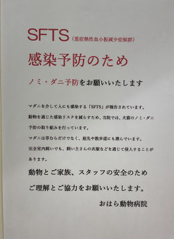 2025/08/26 SFTS感染予防 SFTSはマダニが媒介します。 犬、猫にノミ・ダニ予防を行えば感染リスクを減らせます。 動物のみならずご家族、病院スタッフのためにも、 ノミ・ダニ予防を強く推奨いたします。 ご不明な点は、お気軽にお問合せください。 tagPlaceholderカテゴリ: コメントをお書きください コメント: 0